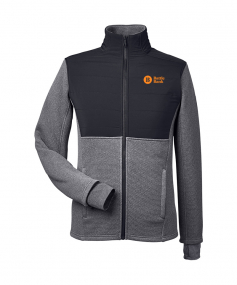 Pillow tech fabric: quilted, lightweight with warmth-retaining fill; Encore double-knit fleece with woven insulation for warmth and comfort.